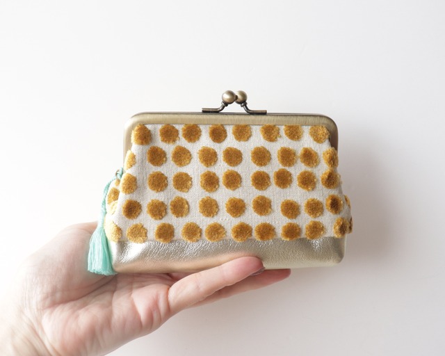 こちらは受注制作となり納期を2週間ほどいただいきます。 ★世界の布 × 手のひらサイズの親子がま口財布★ 国内外から取り寄せた美しい生地を使い、、ひとつひとつ、私の手で丁寧に仕立てたミニ財布です。インドの煌びやかな刺繍、フランスやアメリカのユニークなテキスタイルなど、どれも一期一会の素材ばかり。 手のひらに収まるコンパクトさながら、中にはもうひとつがま口がついた「親子構造」。小銭・お札・カードをしっかり分けて収納できる実用性も魅力です。 素材の風合いや刺繍の美しさを引き立てるよう、革や口金など細部にもこだわりました。タッセル付きで開け閉めも楽しく、見た目のアクセントにも。 ーーーーーーーーーーーーーーーーー ★作品の特徴★ イエローのドットがきらりと輝く、フランス製ベルベット。 そこに箔加工のプラチナカラーの牛革を合わせ、遊び心の中に上品さが漂うミニ財布に仕立てました。 小さくても中はしっかり「親子がま口」仕様。 お札・小銭・カード類が分けて入れられ、手のひらサイズでも使いやすさは抜群です。 デザインから仕立てまで、すべて私自身の手で丁寧に制作しています。 世界中から集めたお気に入りの布と出会い、その魅力を引き出すように一点一点心を込めて。 Golden Dot は、その名の通り「光を感じるドット模様」。 持つたび気分を明るくしてくれるような、ポジティブな存在感をお届けします。 ギフトにもおすすめです ちょっとしたお礼や誕生日プレゼントにぴったりなサイズ感と華やかさ。 贈る相手を選ばないデザインで、ラッピング対応も可能です。 (ご希望の方はオプションでお選びください) ◆素材 金具:ニッケルシルバー(日本製) 表生地:ベルベット+織物 牛革レザー 牛革箔張りレザー プラチナ(国産) 内布/レーヨン ・サイズ 約横13㎝×約縦9.5㎝×奥行約2.5㎝(口金サイズ12㎝) ※ひとつひとつ手作りのためサイズ表記より誤差はございます。(サイズ表記は全て外寸です)ご確認の上ご購入ください。 ■お手入れ 汚れが付着した場合は乾拭きで汚れを拭き取ってください。 天然革を使用しているため、長時間使用しない場合は湿気でカビが発生することがございます。風通しの良い場所に保管するようお願いいたします。 長時間高温な場所へ放置すると変色の恐れがあります。 ※こちらの商品はご注文をいただいてから制作する「受注制作」です。お届けまでに14日ほどお時間をいただきます。一つひとつ丁寧にお作りしておりますので、楽しみにお待ちいただけましたら嬉しいです。 ◆お買い上げ前にお読みください (注意事項) https://uzomuzo.thebase.in/about