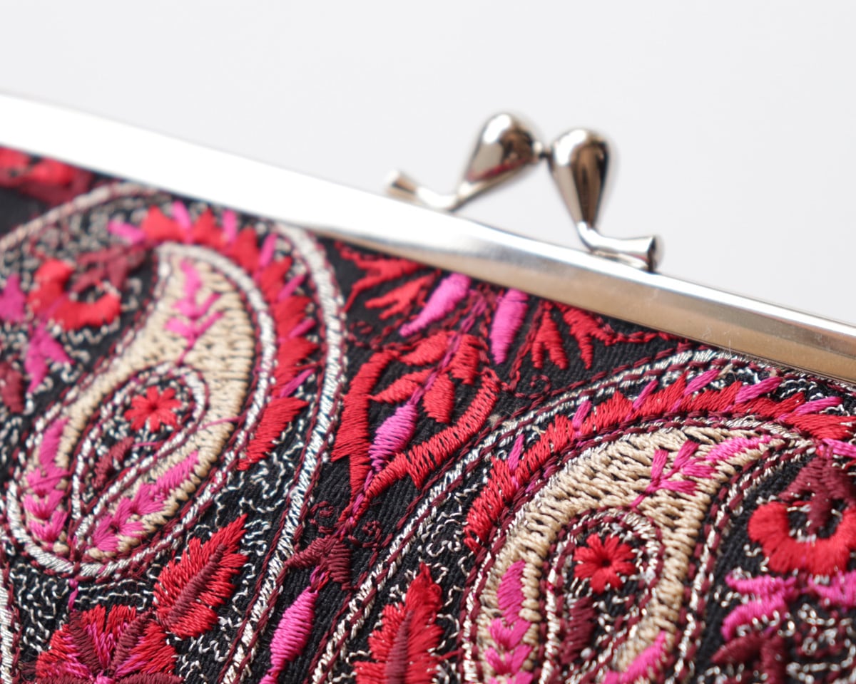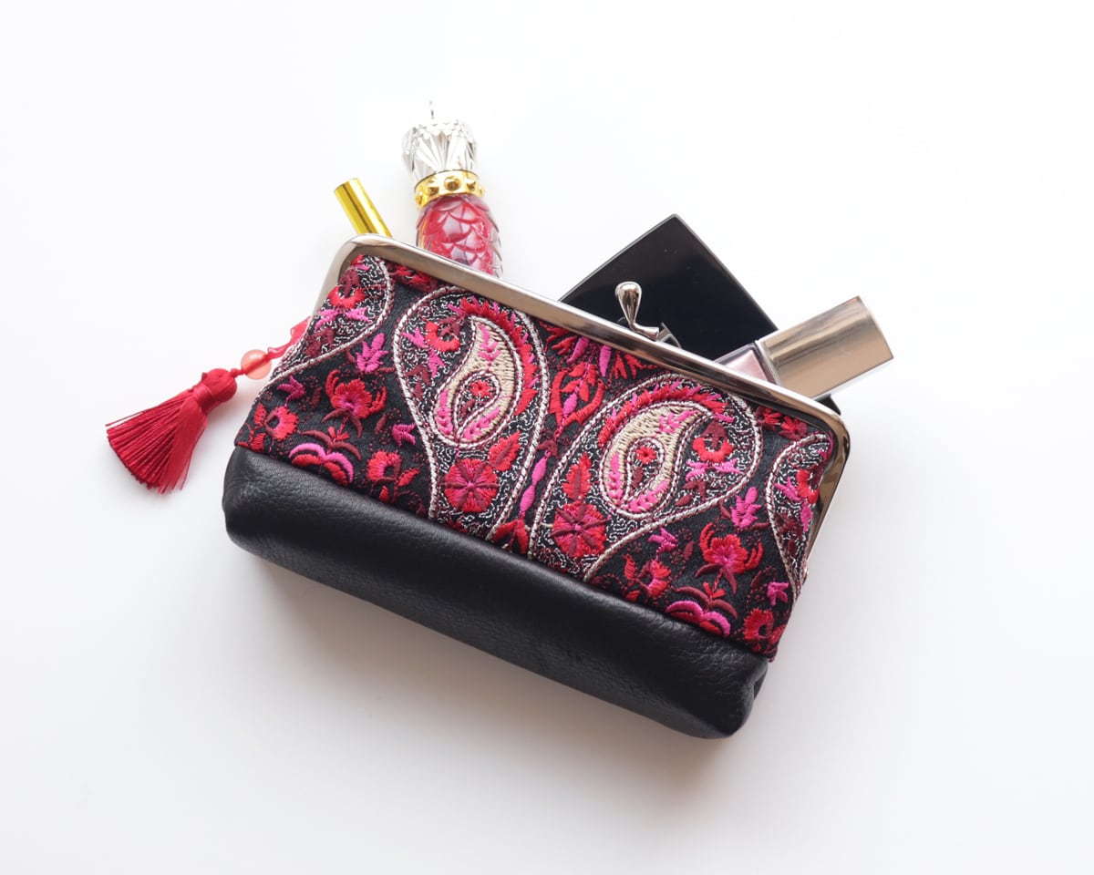 インド刺繍リボンと牛革レザーのがま口ポーチ Oriental Blossom