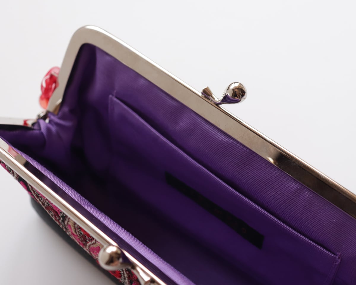 外からは見えない内側の素材までこだわっており、内布は、シャンタン生地。シャンタン生地は、上品で高級感がある質感となっています。見た目だけではなく、がま口を開けた瞬間にも、気分が上がるような雰囲気を醸し出してくれます。