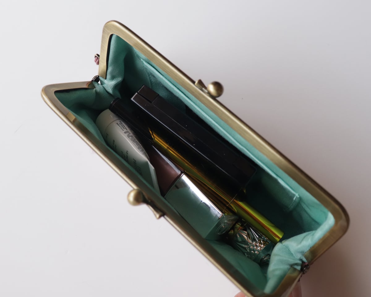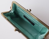 外からは見えない内側の素材までこだわっており、内布は、シャンタン生地のミントグリーン色。シャンタン生地は、上品で高級感がある質感となっています。見た目だけではなく、がま口を開けた瞬間にも、気分が上がるような雰囲気を醸し出してくれます。