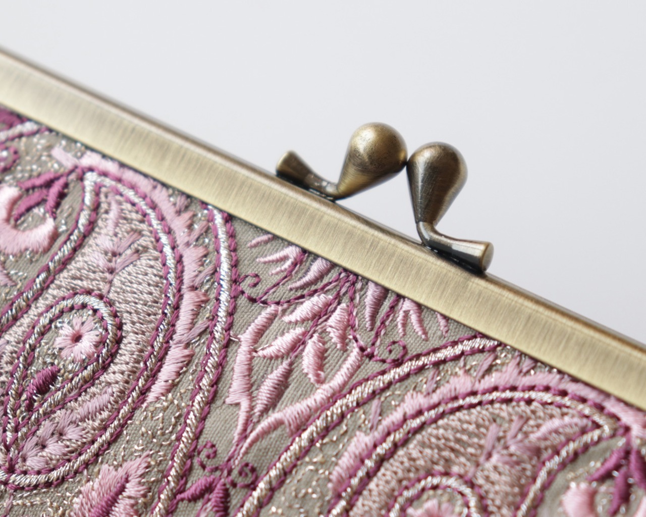 インド刺繍リボンと牛革レザーのがま口ポーチ ペイズリー pink