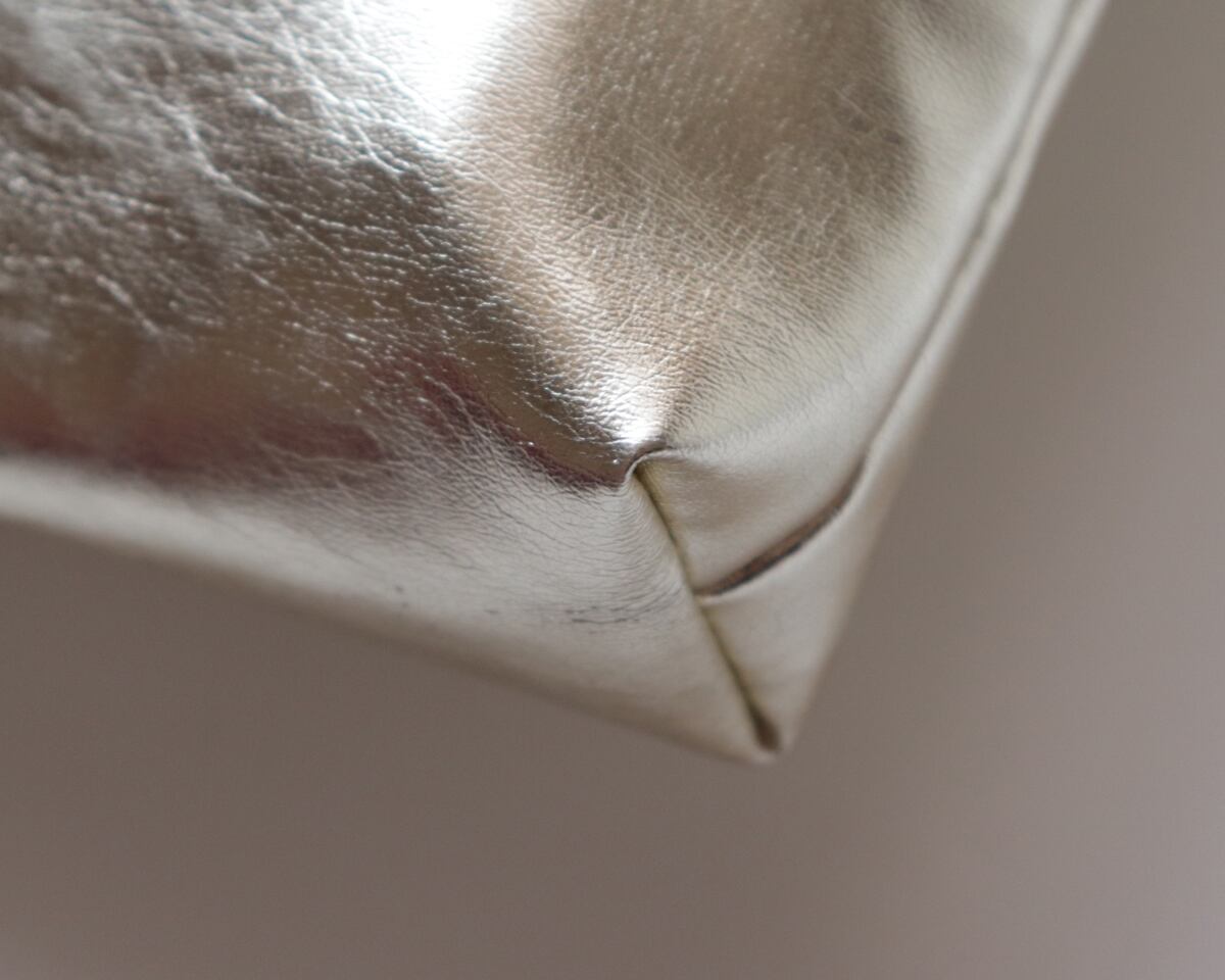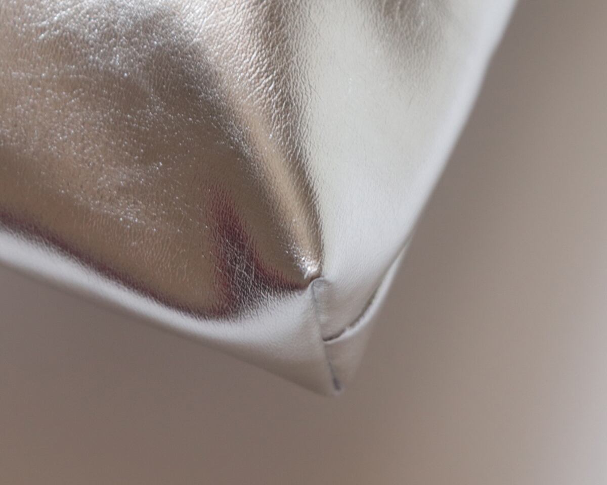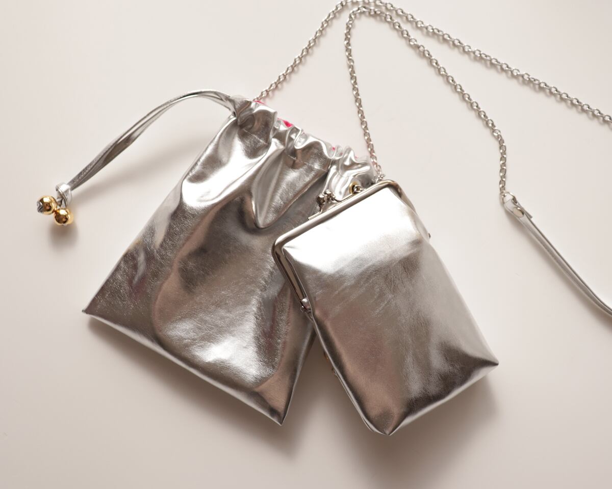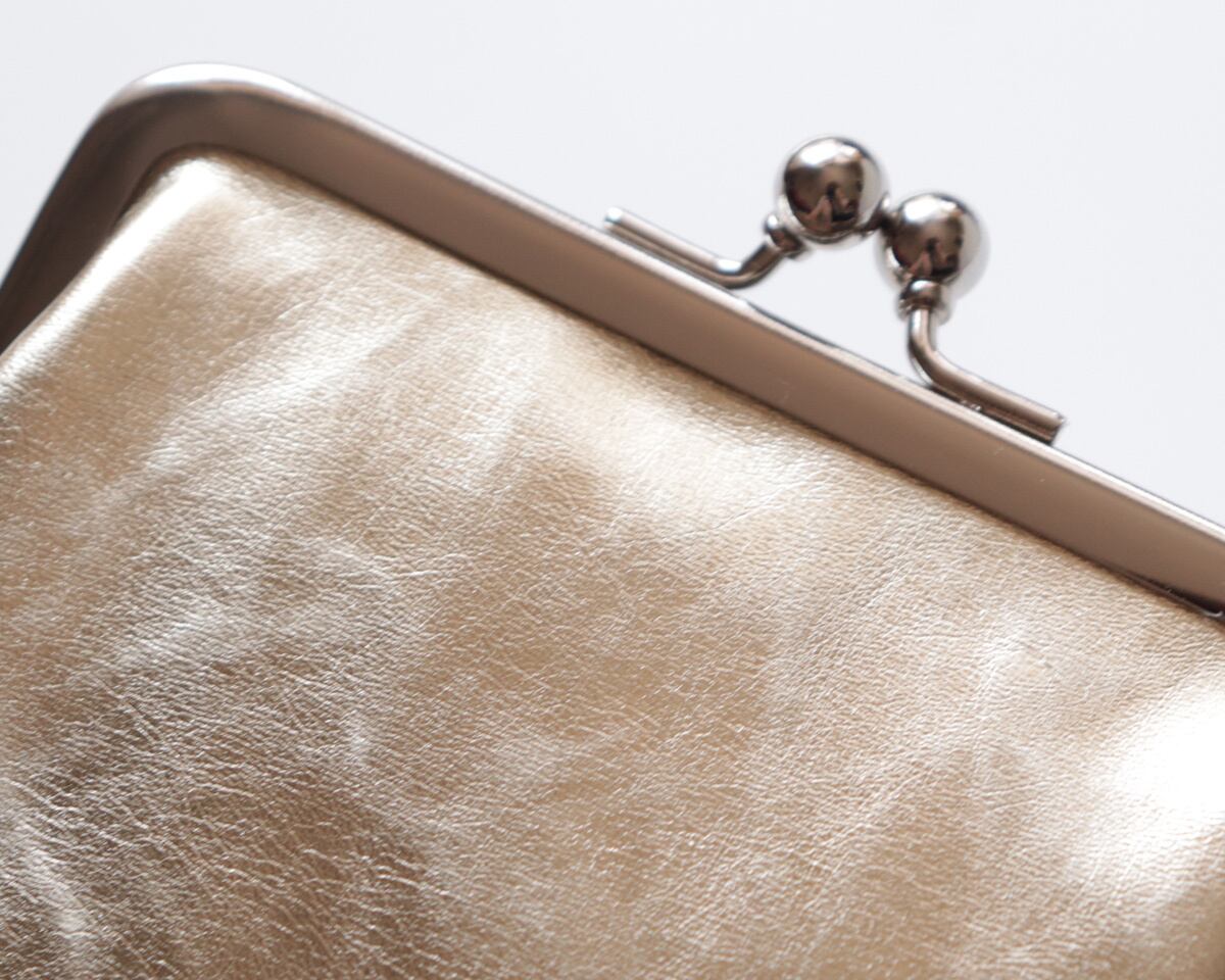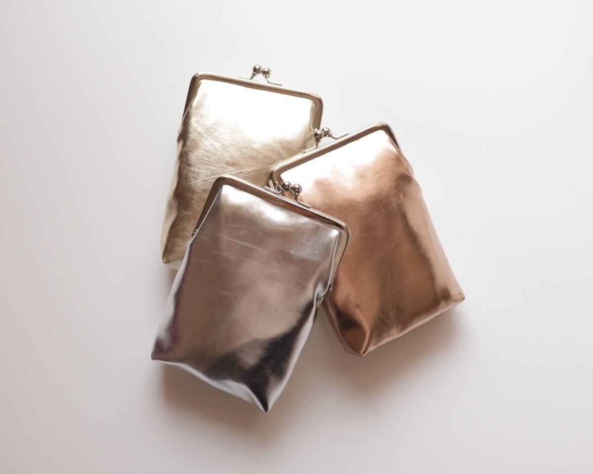 先日ご紹介した【メタリック巾着ショルダー】と同じ素材で仕立てた、がま口タイプのポーチです。内側には中綿を入れており、ふんわりとしたクッション性があります。
