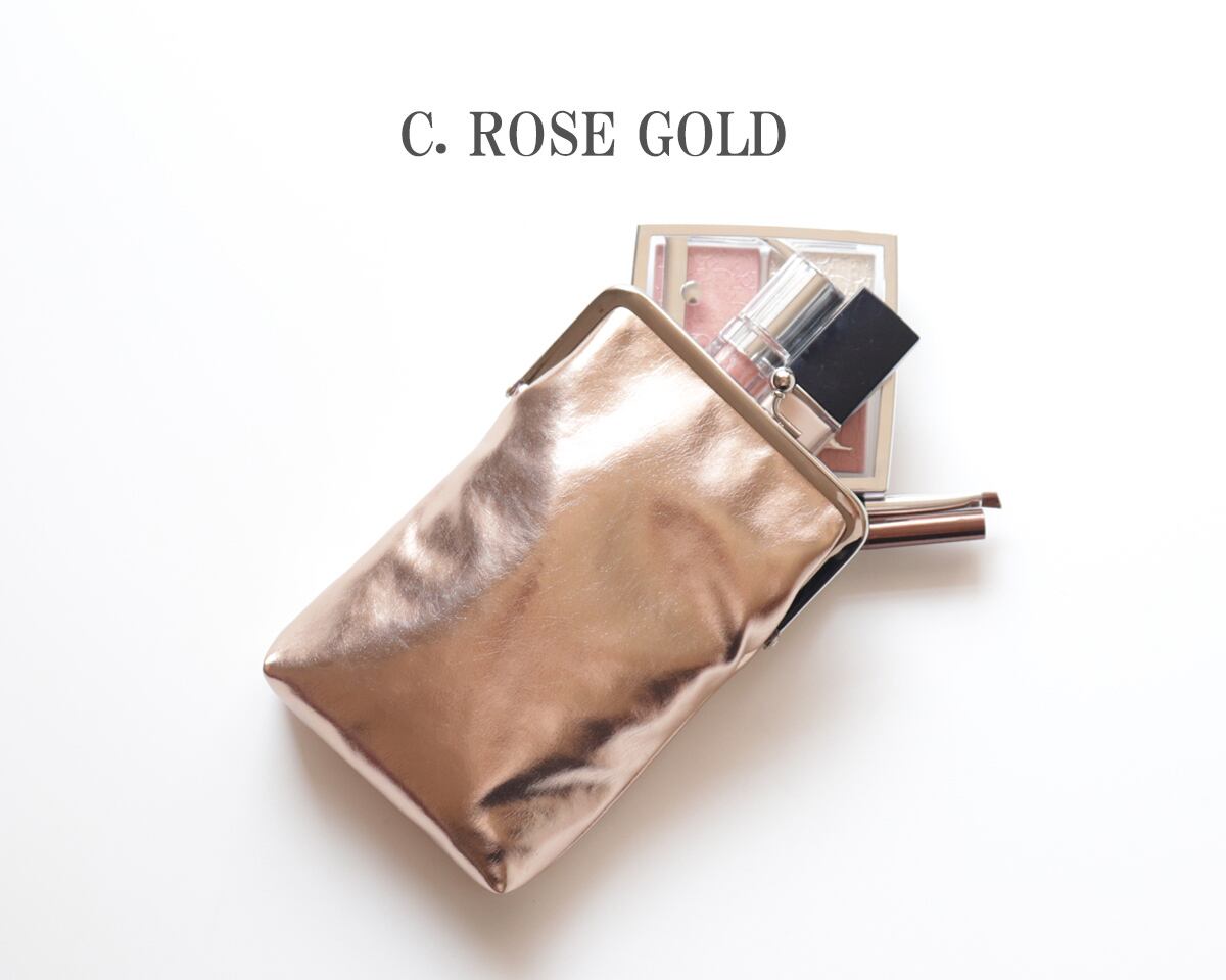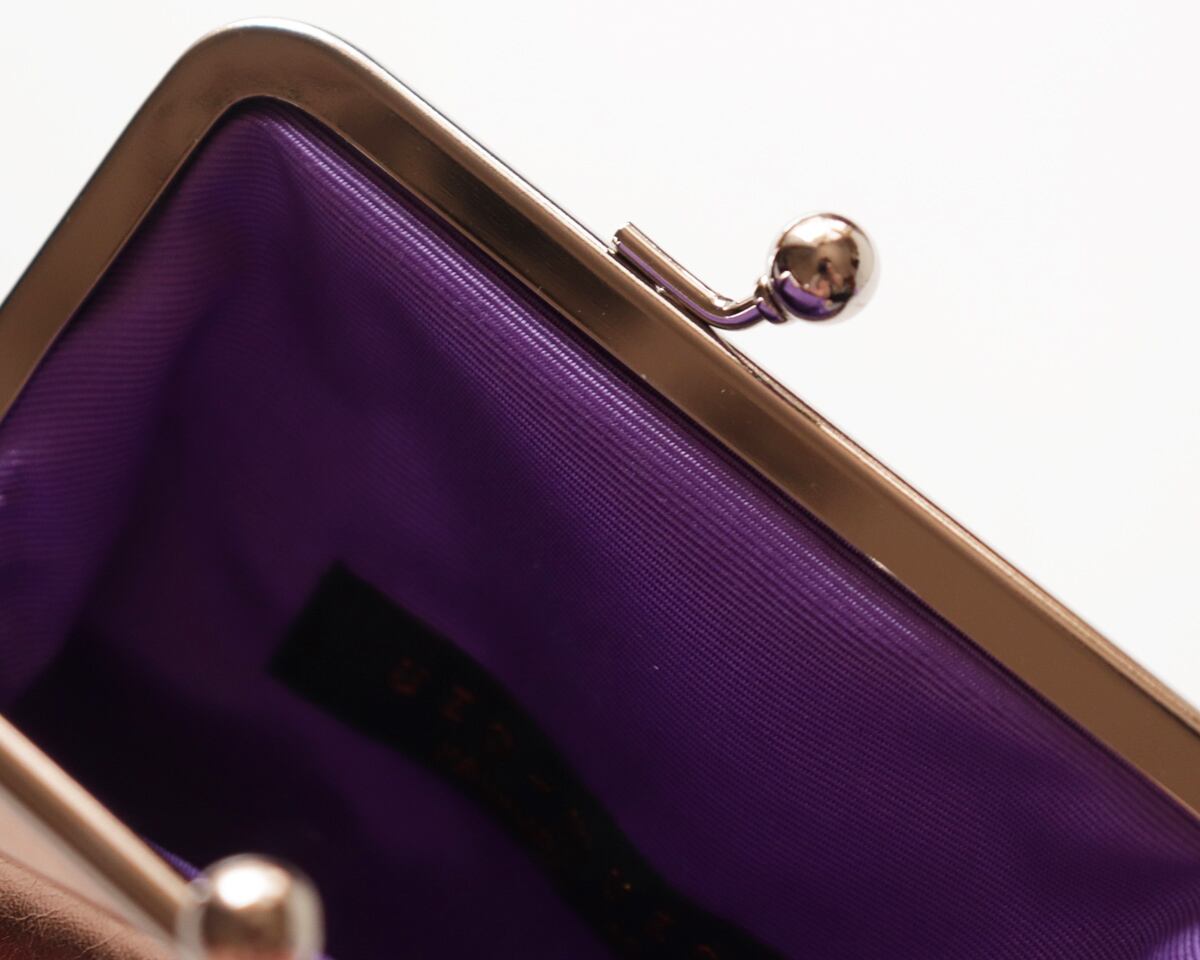 やさしい華やかさで、肌なじみも抜群のピンクゴールドのがま口ポーチ。上品なピンクニュアンスが、毎日のコーデをふんわり華やかに彩ります。甘すぎない輝きだから、大人フェミニンな装いにもぴったり。内布はパープルで、落ち着いた中に可憐さを感じさせます。