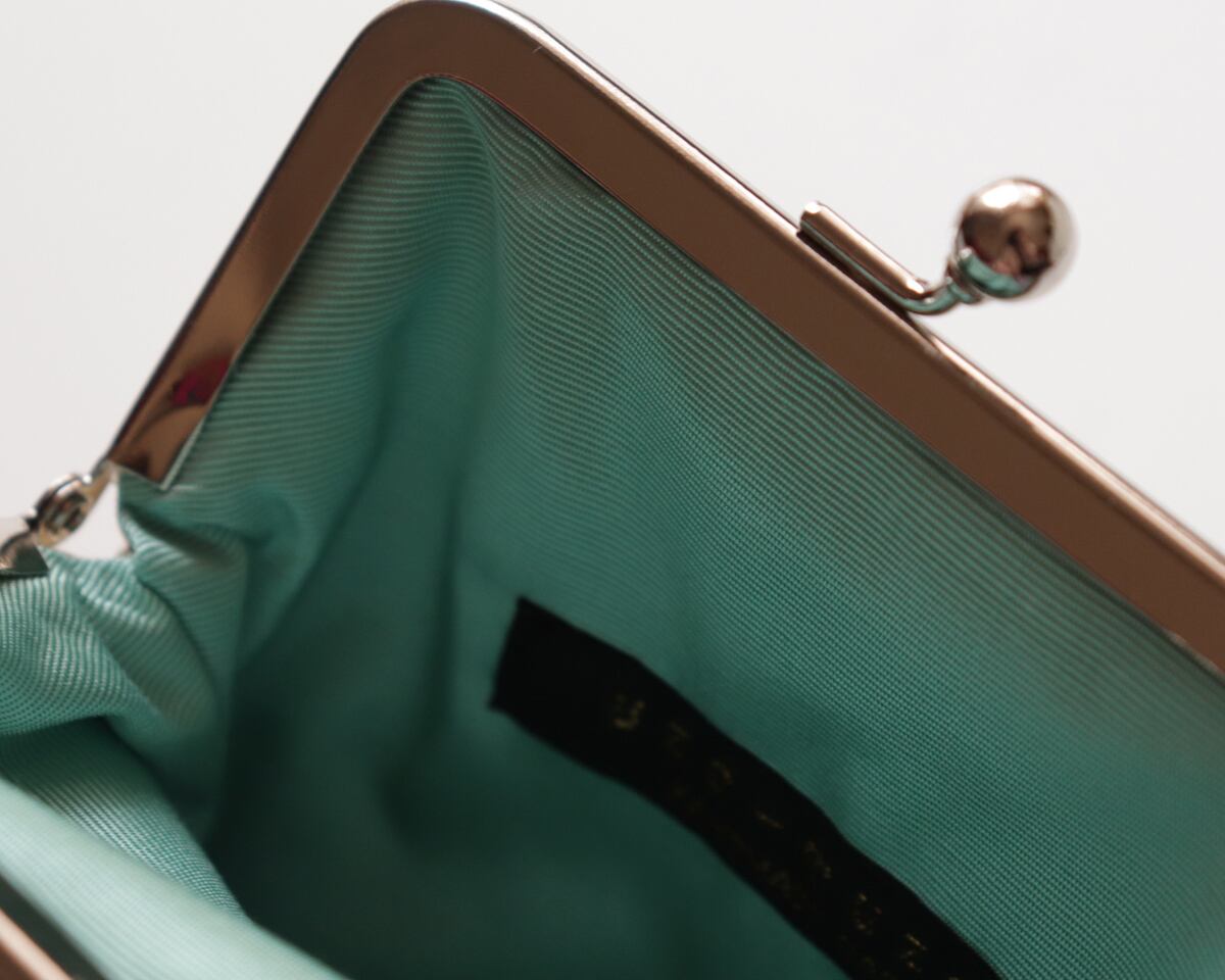 落ち着いた輝きが上品な、プラチナゴールドのがま口ポーチ。強すぎない黄みで肌なじみがよく、どんな装いにも自然に寄り添います。まるでジュエリーのように、コスメや小物をそっと包み込んでくれる存在。内布はミントグリーンで、爽やかなアクセントになっています。
