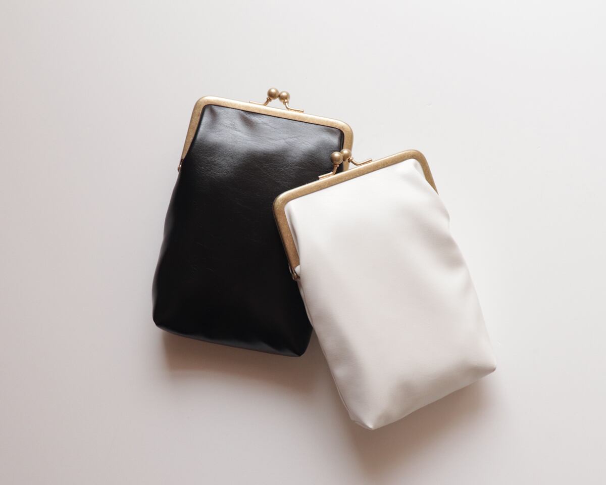 シンプルで永く愛される定番カラー、ホワイトとブラックのがま口ポーチ。