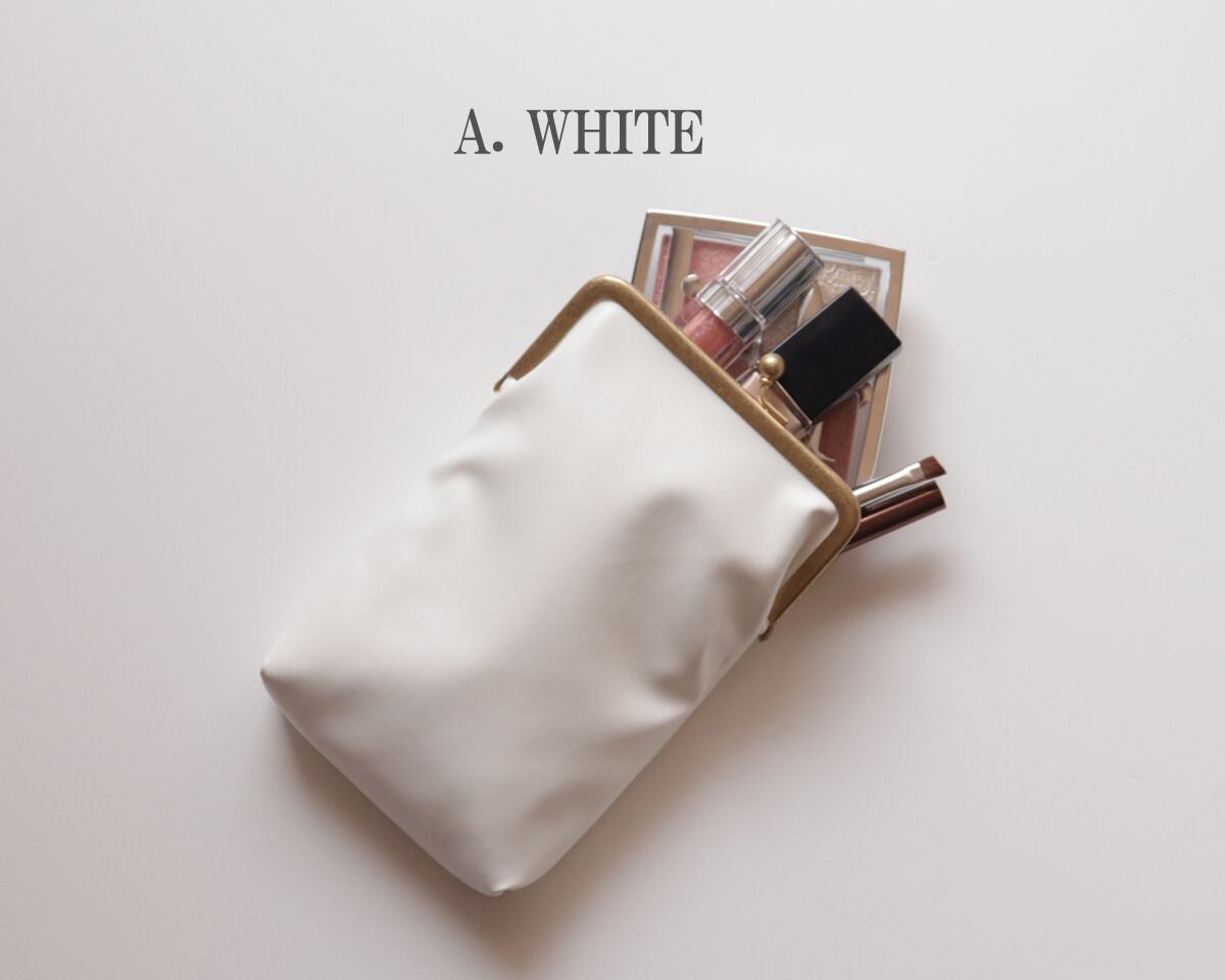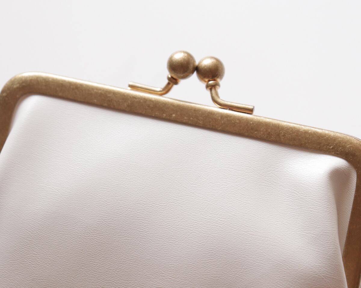 清潔感あふれるホワイトのがま口ポーチ。シンプルでありながら、上品な存在感を放ちます。
