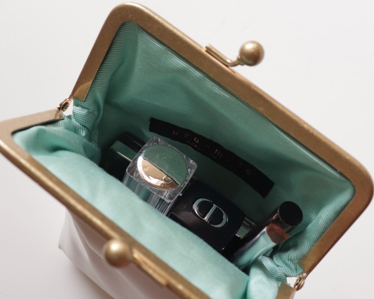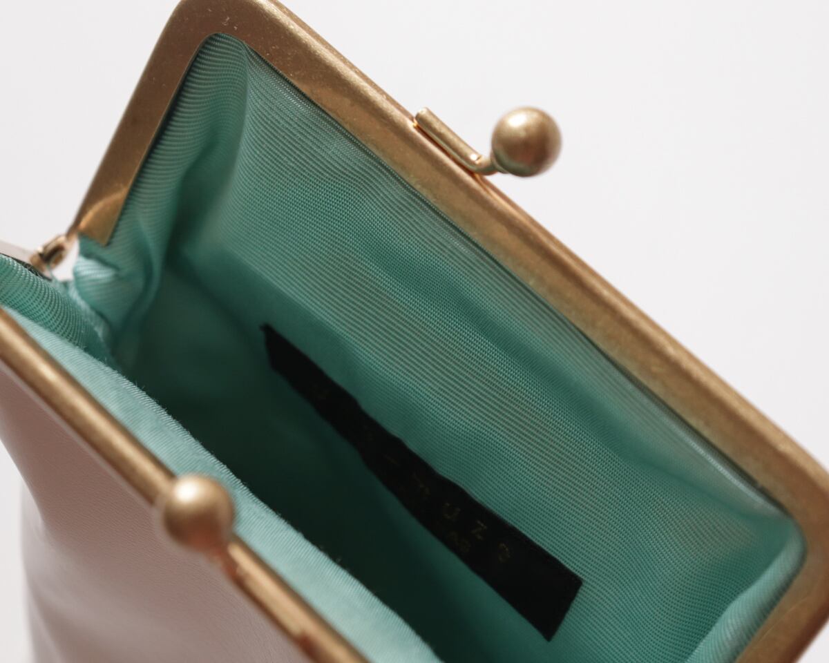 どんなアイテムとも相性がよく、バッグの中を明るく見せてくれる万能カラー。季節を問わず活躍する、ひとつは持っておきたい定番です。口金には、一般的なシルバーやゴールドとは異なる“特別な色合い”をセレクト。ゴールドより落ち着きのある輝きが、より洗練された印象を引き立てます。内布はミントグリーンで、爽やかなアクセントになっています。