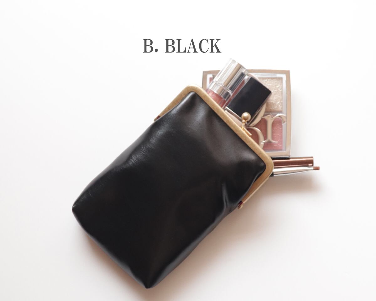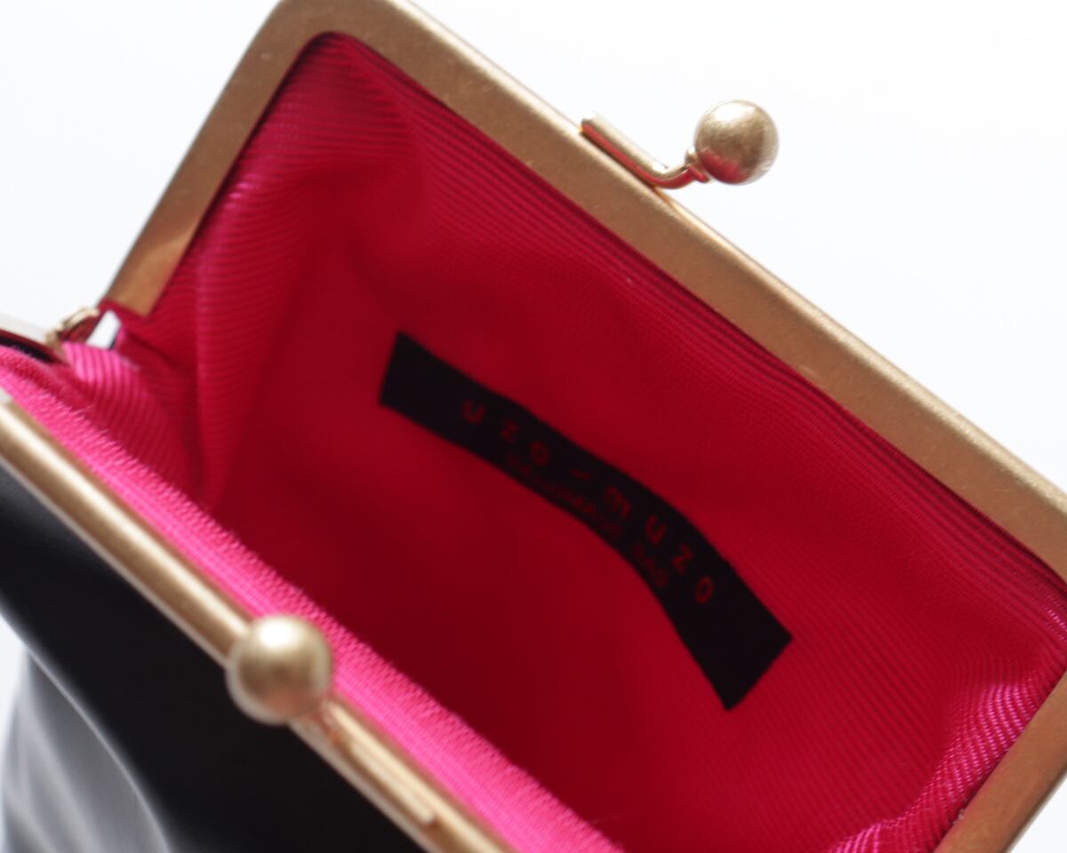 シックでモダンなブラックのがま口ポーチ。余計な装飾を省いたミニマルなデザインが、大人の落ち着きを感じさせます。バッグの中の小物をすっきりとまとめ、フォーマルにもカジュアルにも合わせやすい万能カラー。口金は、WHITEと同じく“特別な色合い”をセレクト。そして内布には鮮やかなショッキングピンクを使用。開けるたびにハッとする遊び心が、シンプルな中に個性をプラスしてくれます。