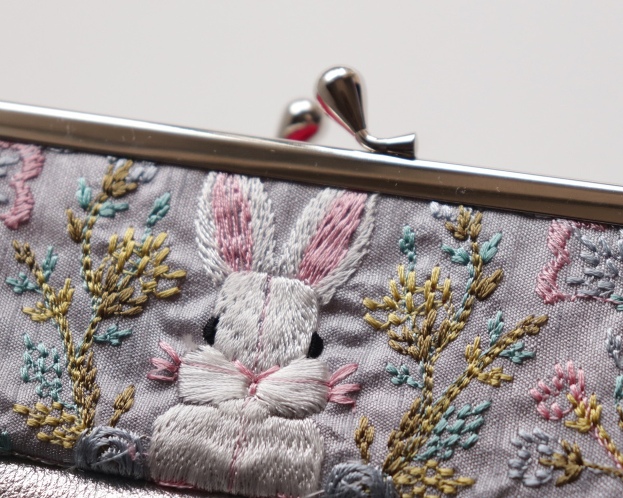 やさしいグレーの生地に、草花とうさぎモチーフの刺繍をあしらいました。