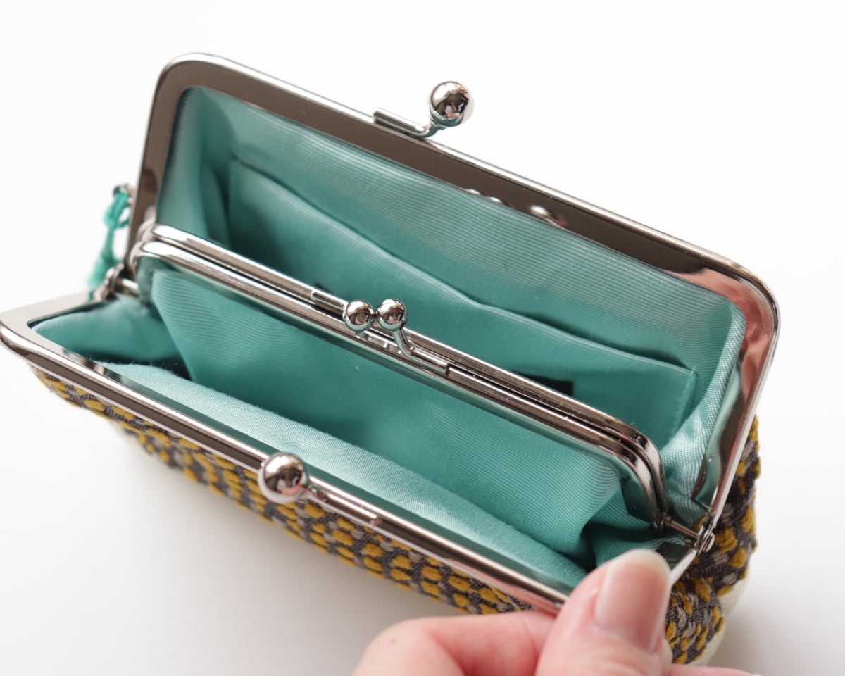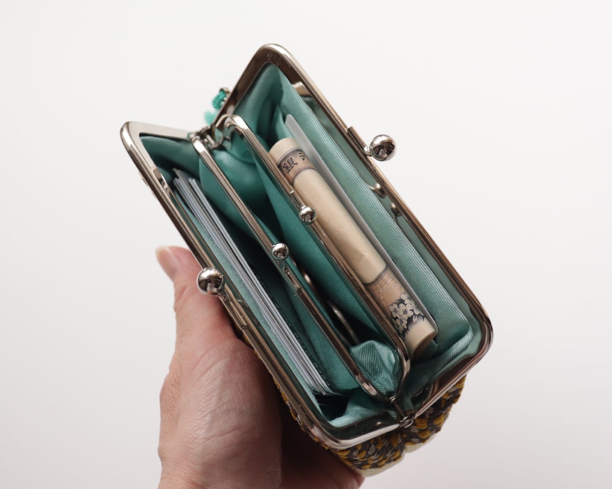 手のひらに収まるコンパクトさながら、中にはもうひとつがま口がついた「親子構造」。小銭・お札・カードをしっかり分けて収納できる実用性も魅力です。普段使いはもちろん、旅行や年末年始のイベントシーズンにも重宝します。