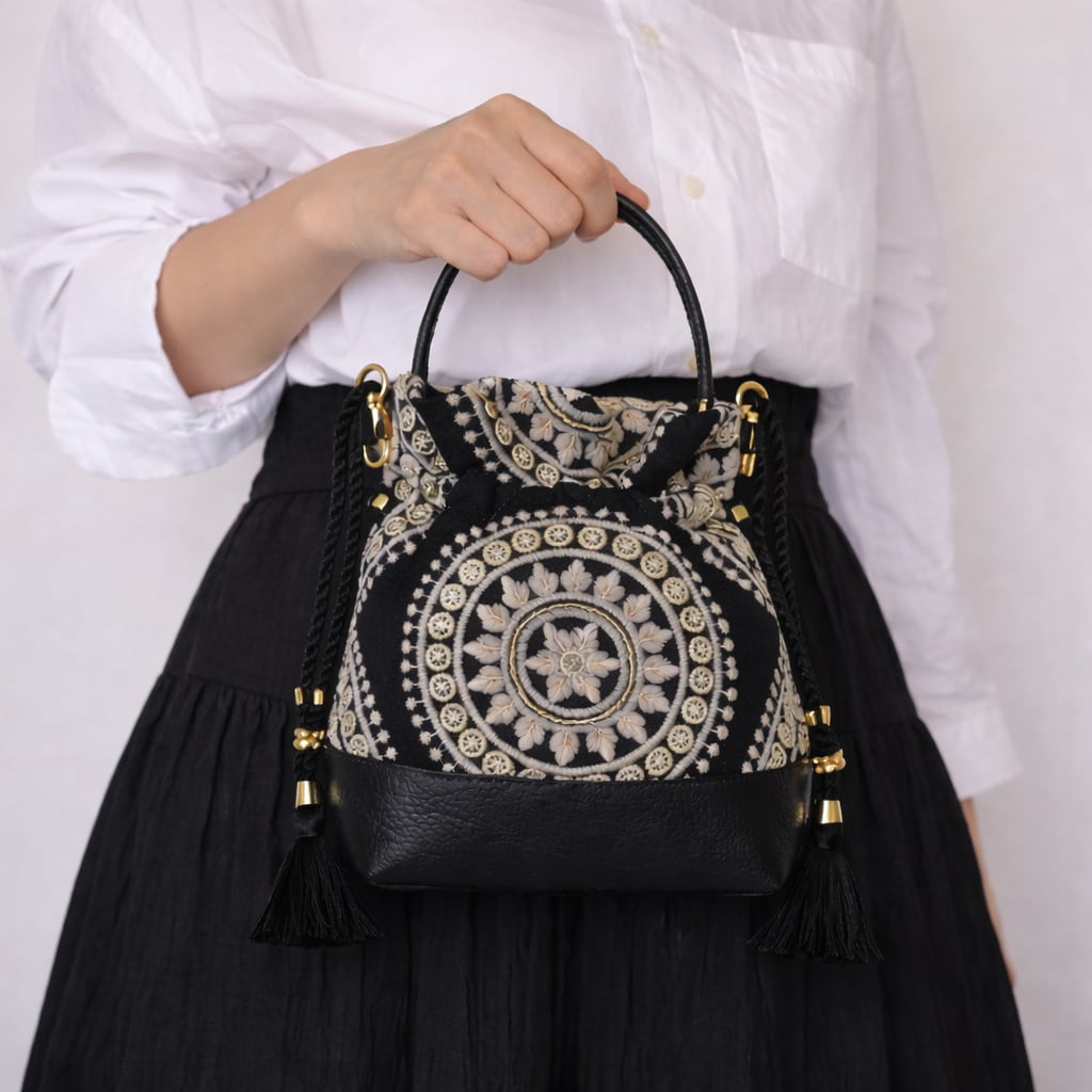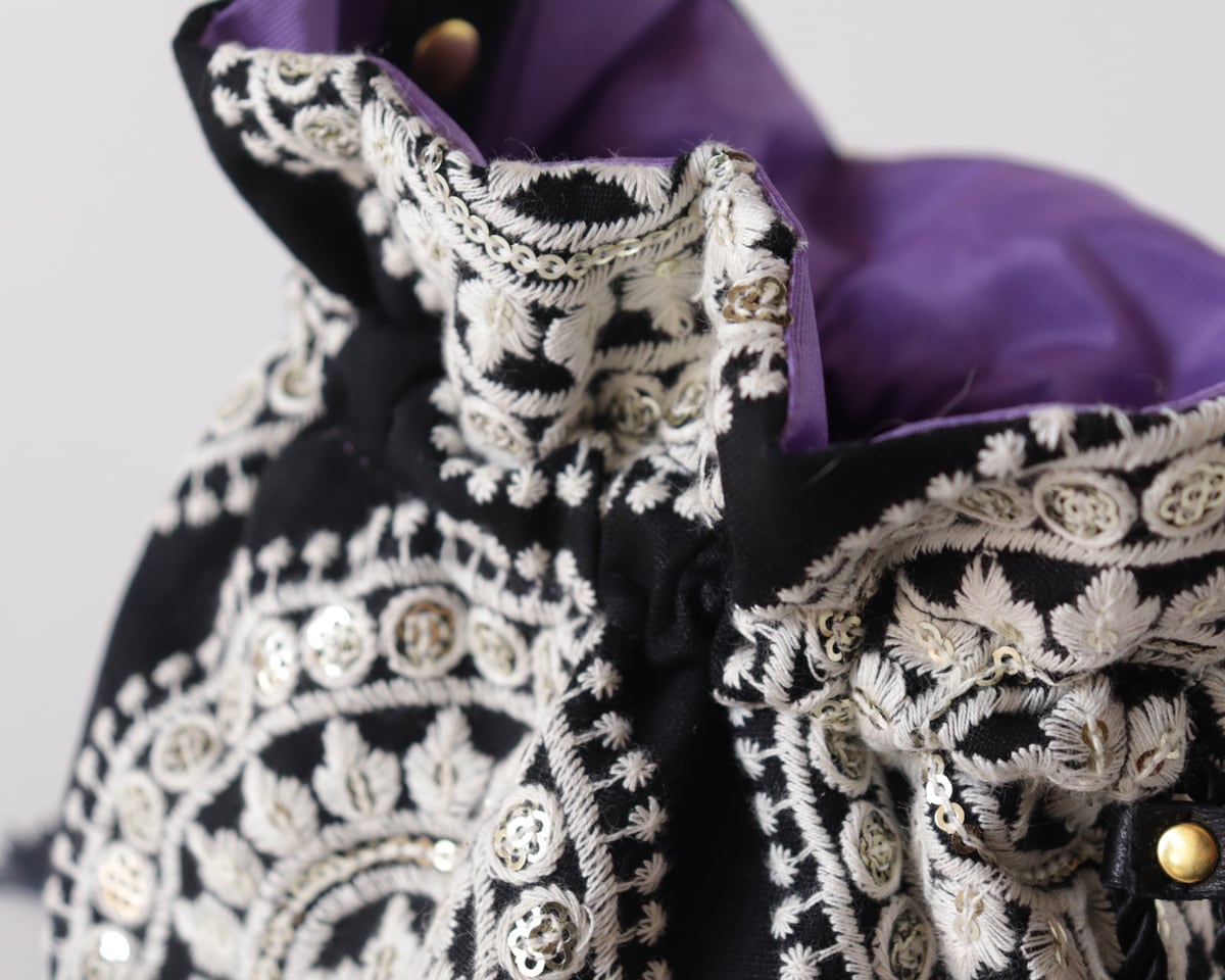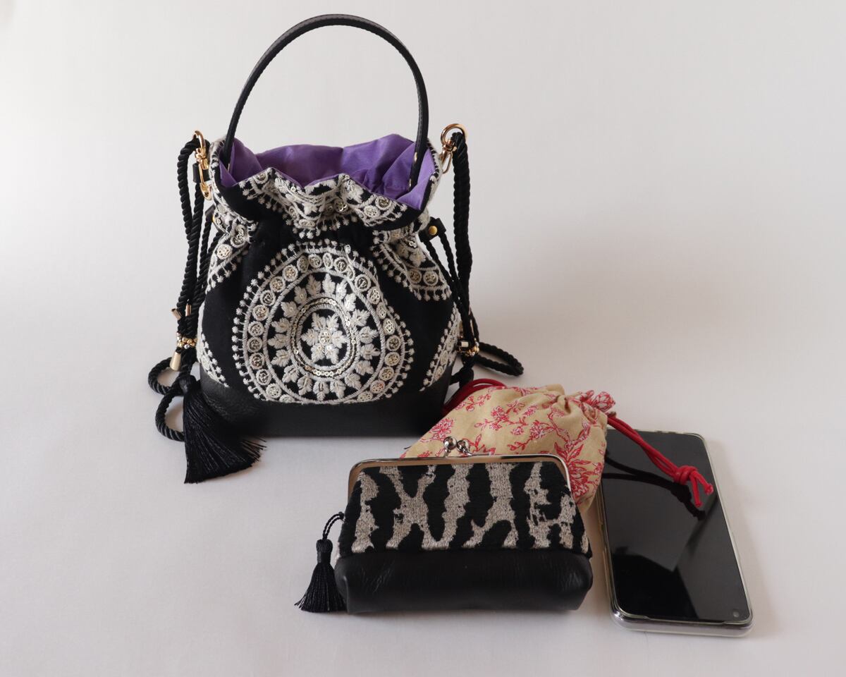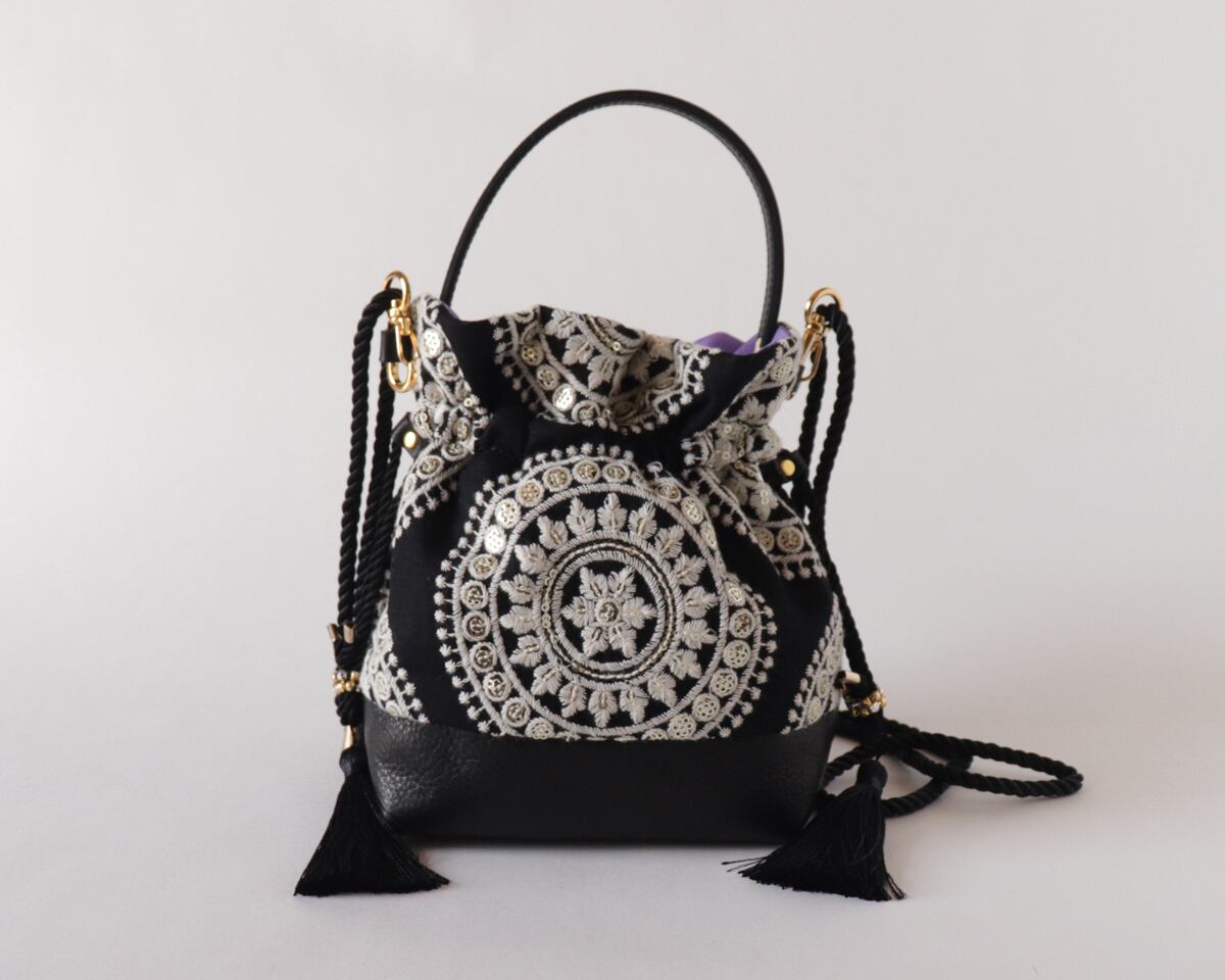 インド刺繍と牛革レザーの2way 巾着ミニバッグ ショルダー BLACK