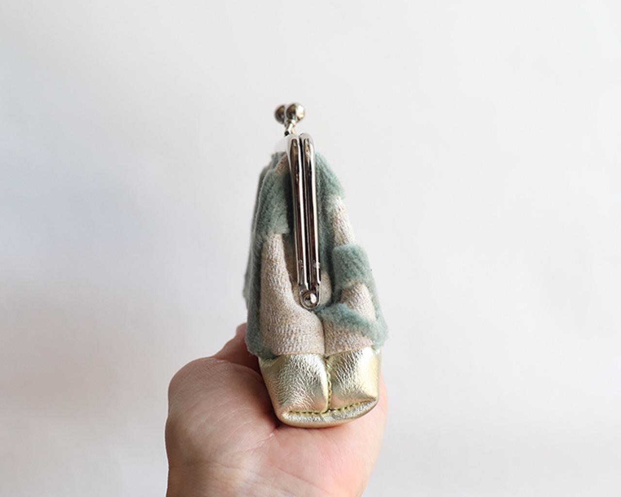 ベルベッド生地の親子がま口財布・小物入れ Mint Green×platinum