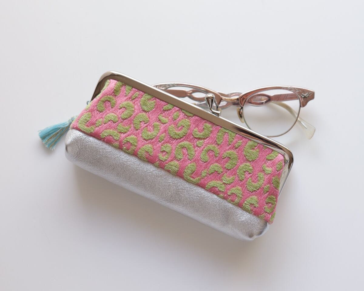 ジャガード織レオパード柄と牛革レザーのめがねケース ・ペンケース PINK