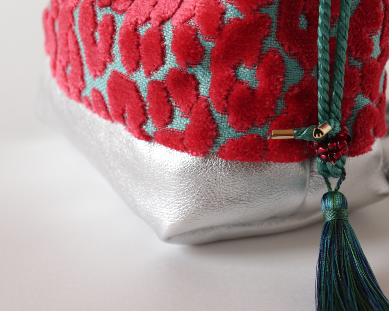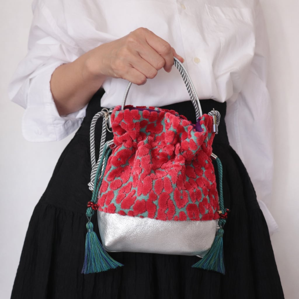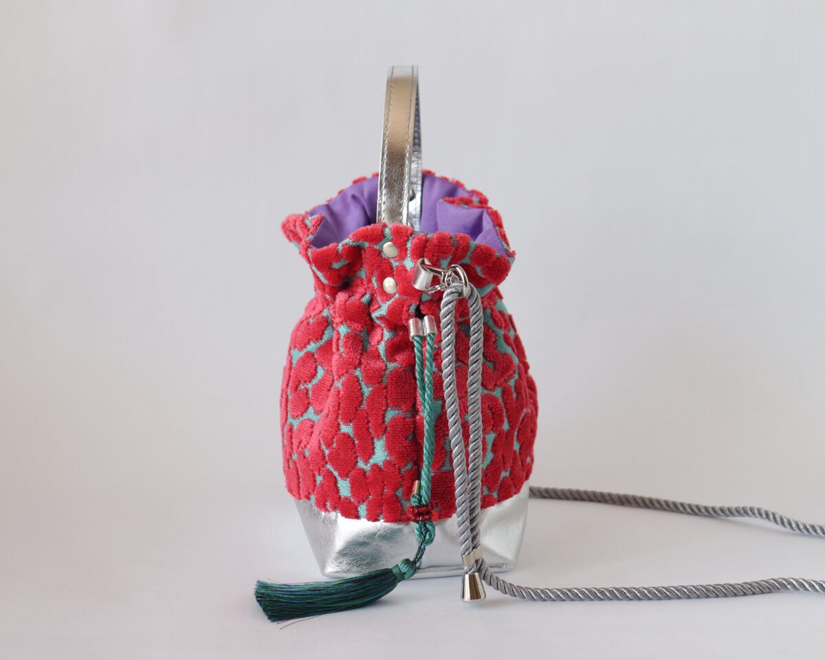 レオパード柄と牛革レザーの2way 巾着ミニバッグ ショルダー Hot pink Velvet & Turquoise×Silver