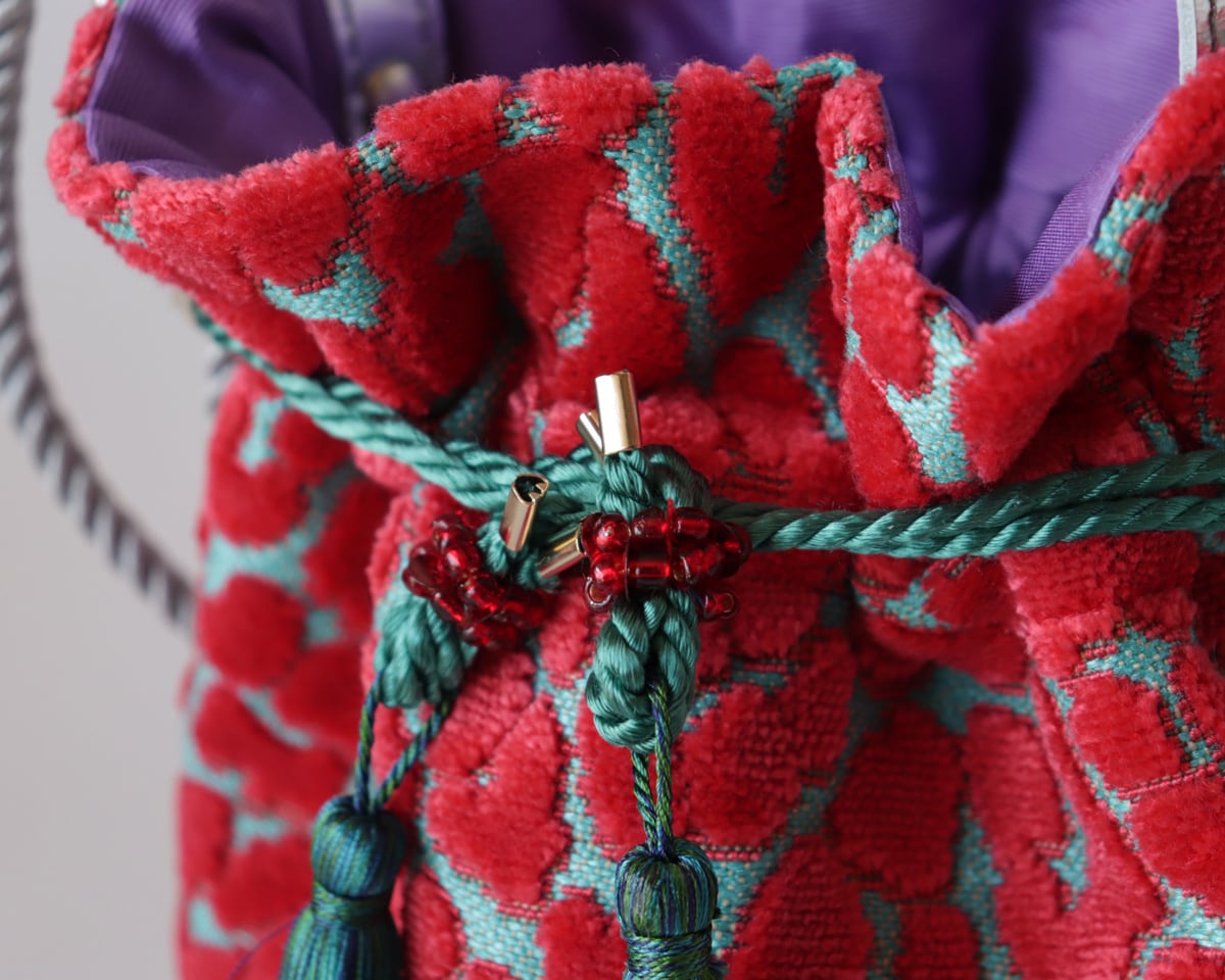 カラフルで個性的なレオパード柄が目を引く2way巾着ミニバッグ。Hot pinkとTurquoiseのカラーコンビネーションが、おしゃれなアクセントになります。ベルベット素材で上品な質感を演出し、ショルダーバッグとしても使用可能なので、使い勝手も抜群です。
