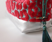 きれいなターコイズのベースにレオパード柄の鮮やかな色ホットピンクのベルベットの気分があがるような生地。見ているだけでもわくわくするような配色のファブリックです。