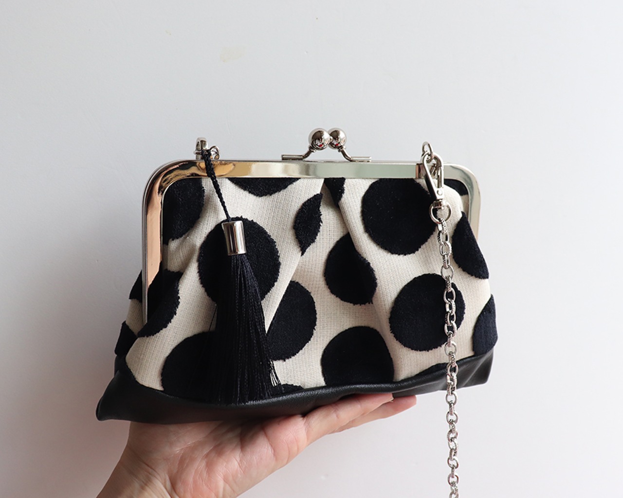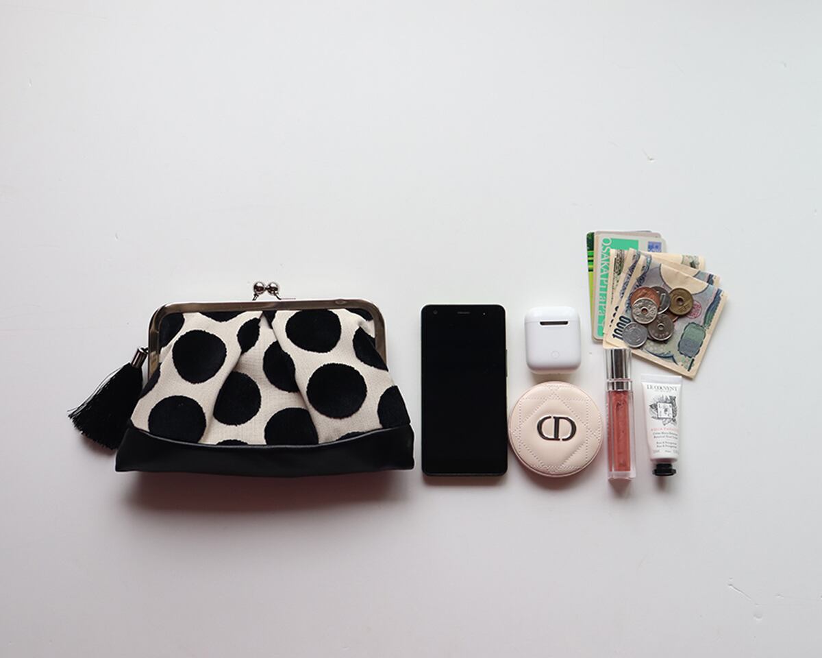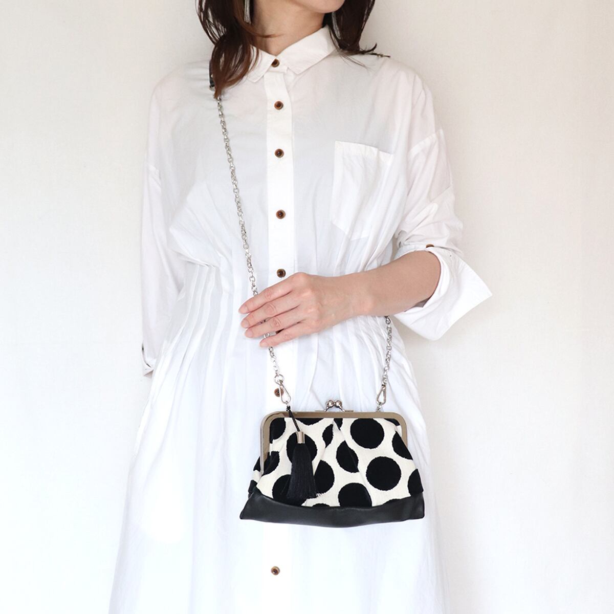アメリカからの上質なドット柄ファブリックと牛革の組み合わせ。荷物を最小限に持ちたい方や、身軽にお出かけしたい方にぴったりながま口お財布バッグです。