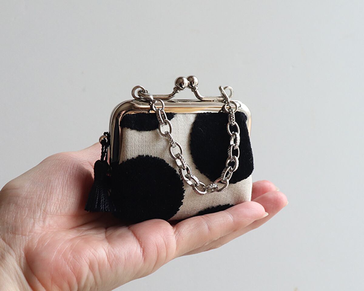 チェーン付きミニミニがま口の小銭入れ。小銭を入れたり、アクセサリー入れやピルケースとしてバッグチャームとしてお使いいただけます。