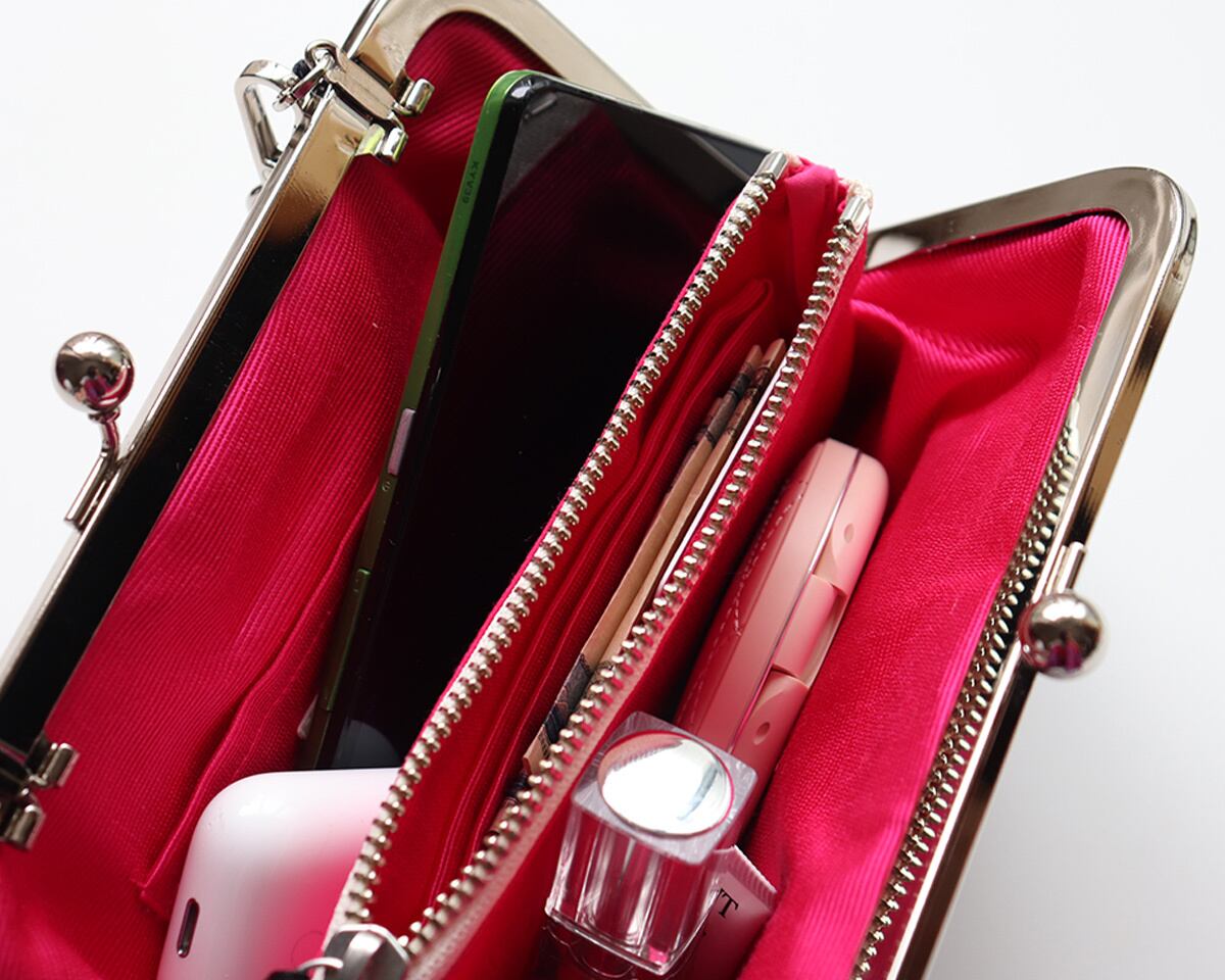 サイズは、iPhone13がすっぽり入る大きさ。がま口を開けると、3つの仕切りとなっているため、貴重品と小物を分けて入れられるのがポイントです。