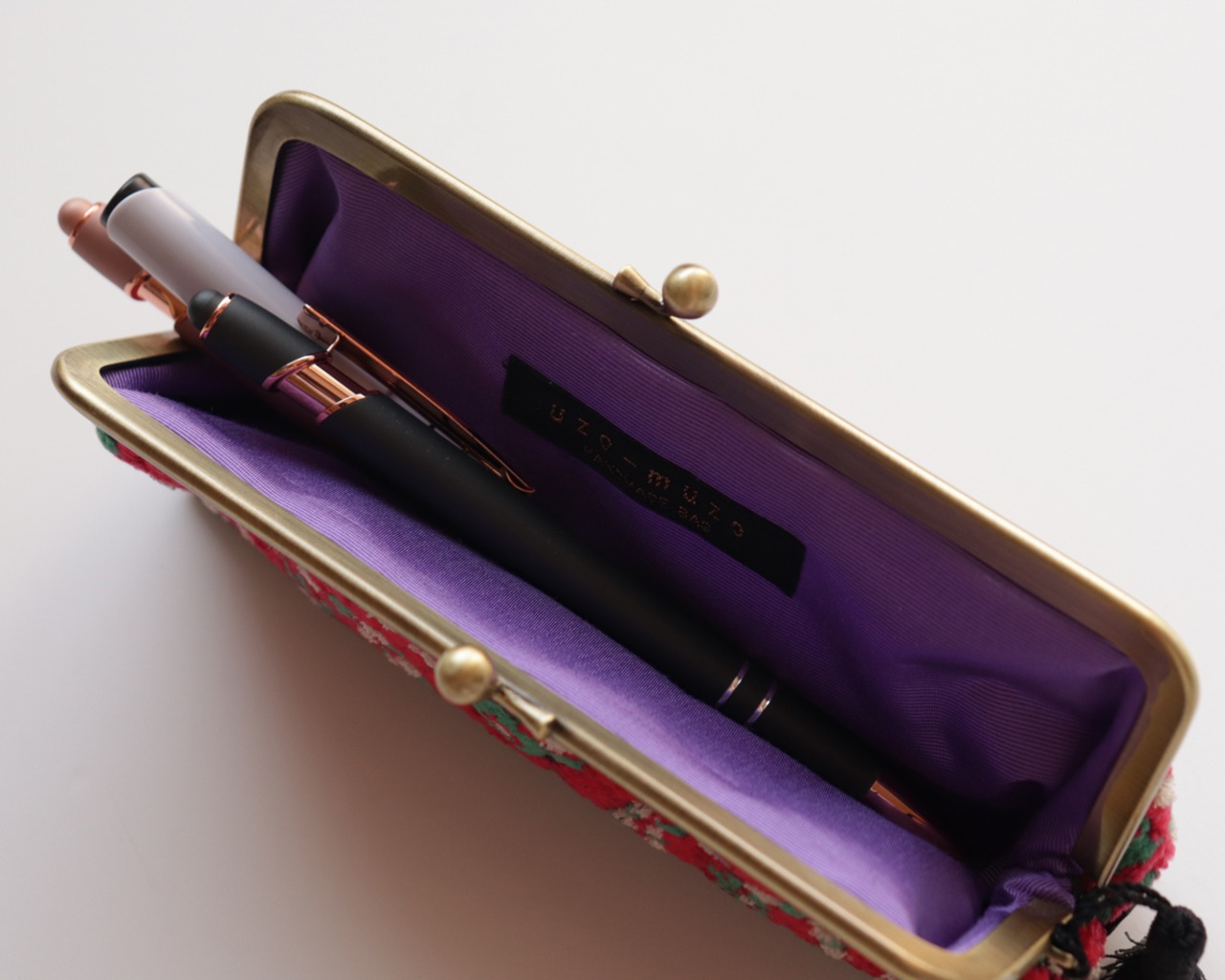 日本の伝統織物「金華山織(ジャガードパイル)」を贅沢に使用し、uzo-muzoオリジナルのペイズリー柄を施しためがねケース・ペンケースです。上品なレッドとブラックの配色が、シンプルながらも華やかな印象を与えます。