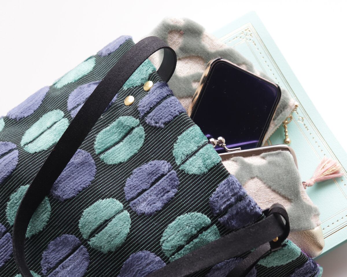 ぽこぽこがかわいい上質なジャガードパイルのファブリックと牛革レザーの組み合わせで上品な仕上がりとなりました。A4サイズのノートやファイルが入る大きさなのでお稽古やお仕事用のサブバッグとしても活躍します。革を使用していますが生地はふわっと軽いジャガードなので重量も軽いバッグです。肩にかけても手提げでもお使いいただけます。