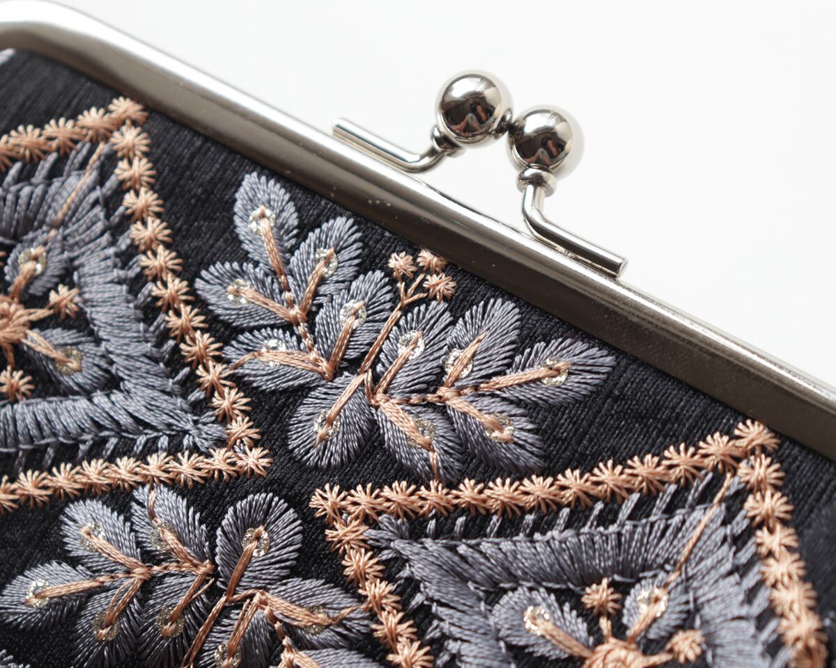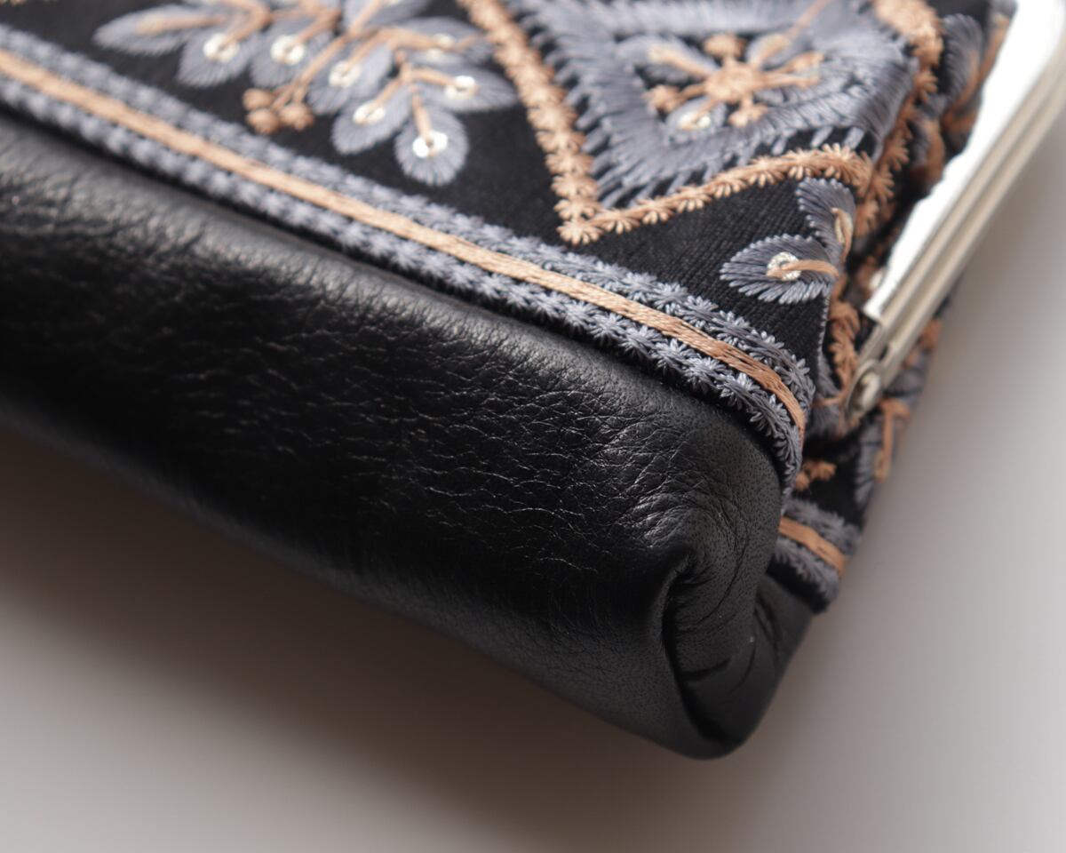 ・インドから届いたインドらしい独創的な刺繍。細部まで行き渡るクオリティの高い刺繍は見るからに高級感があります。この生地に国産の牛革とパチンと閉まりのよい国産の口金を使用しとても贅沢な一品が出来上がりました。