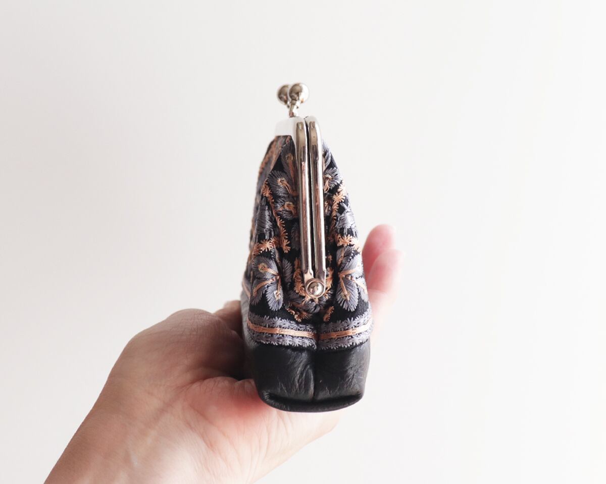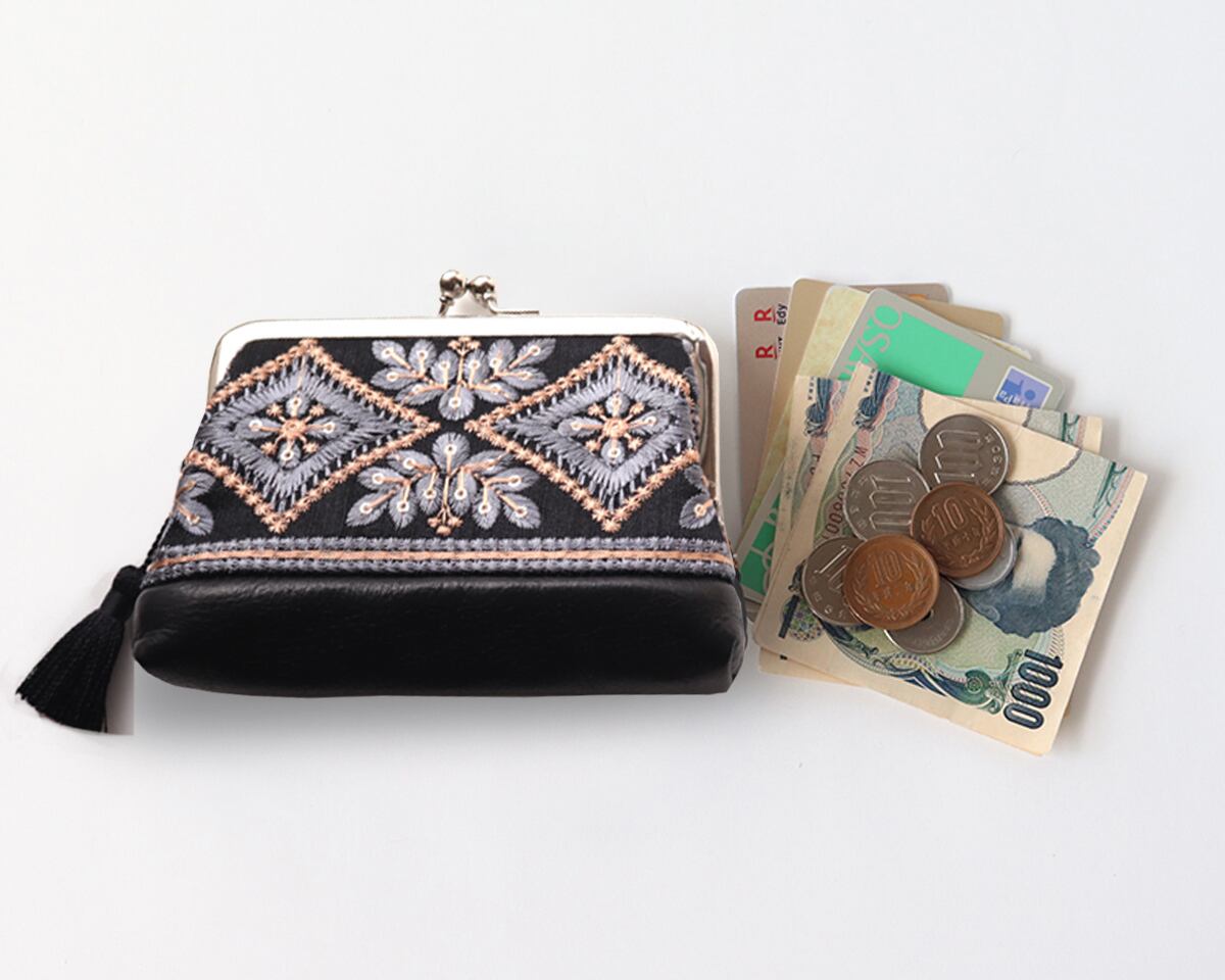 【ラスト一点】親子がま口財布・小物入れ インド刺繍リボンと牛革レザー BLACK