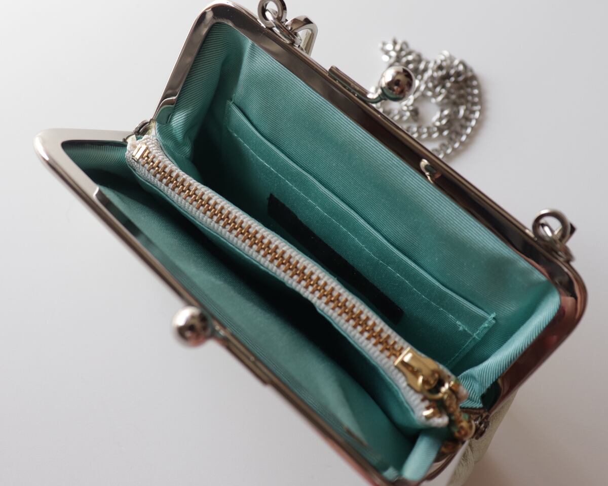 外からは見えない内側の素材までこだわっており、内布は、シャンタン生地。シャンタン生地は、上品で高級感がある質感となっているため、見た目だけではなく、がま口を開けた瞬間にも、気分が上がるような雰囲気を醸し出してくれます。