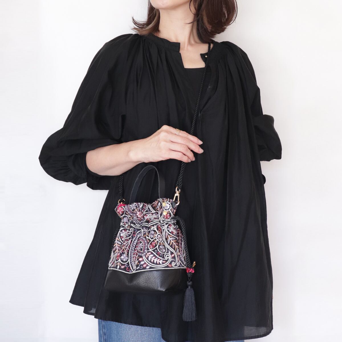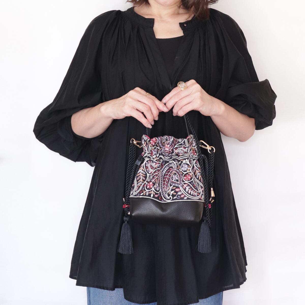 インドリボン刺繍と牛革レザーの2way 巾着ミニバッグ ショルダー Paisley Nights